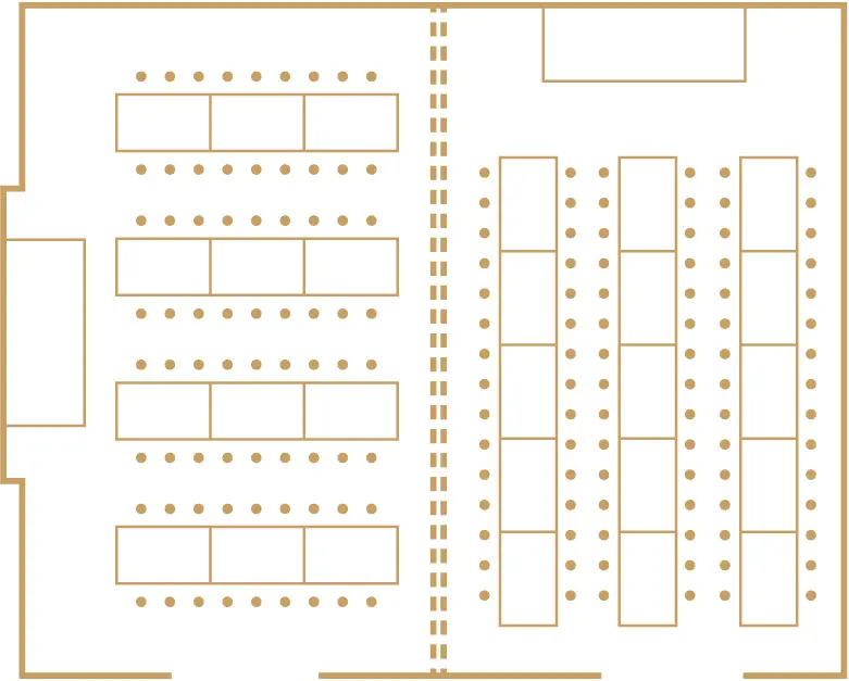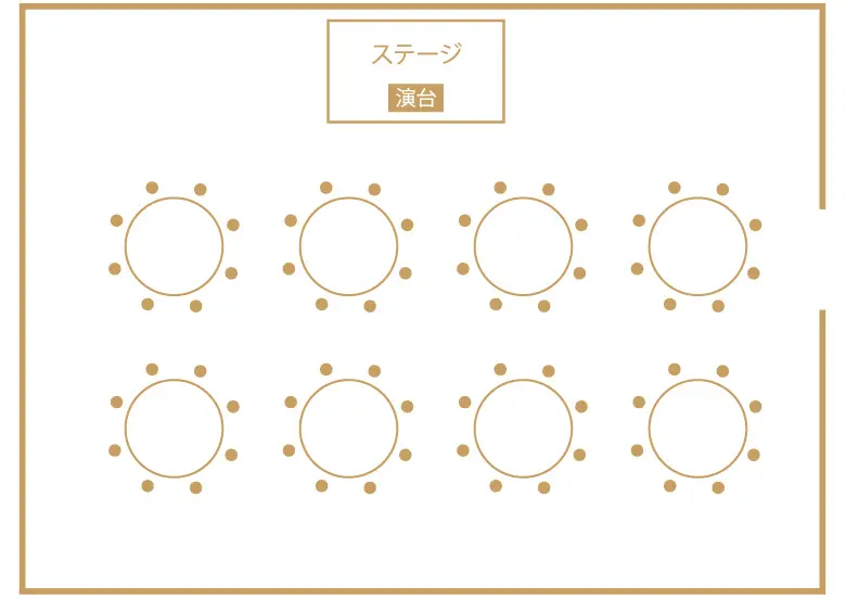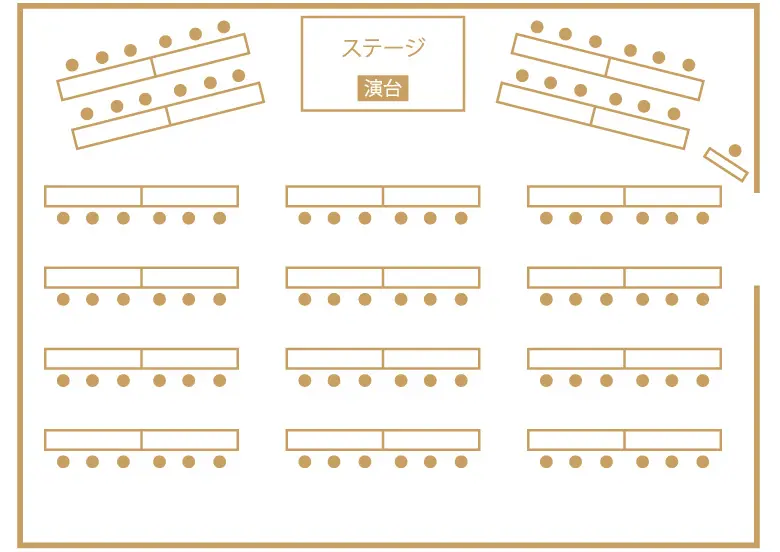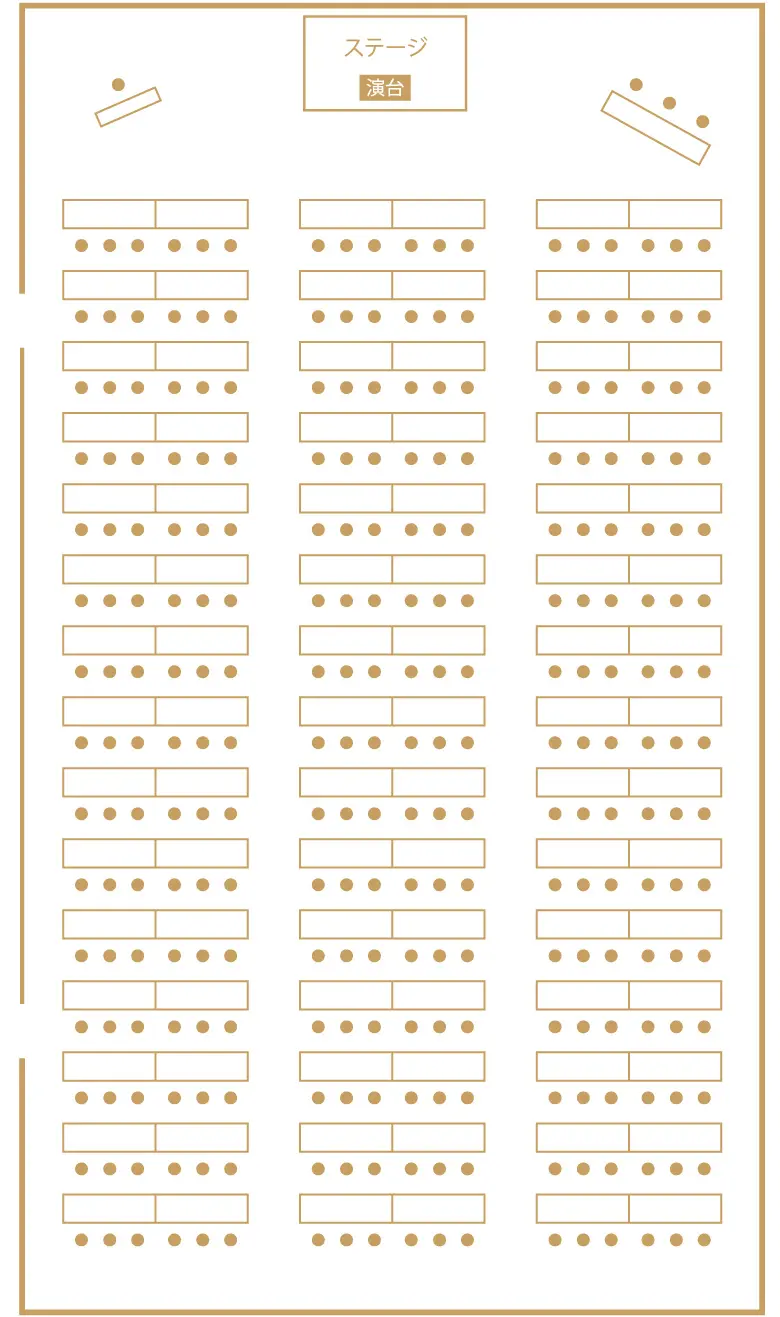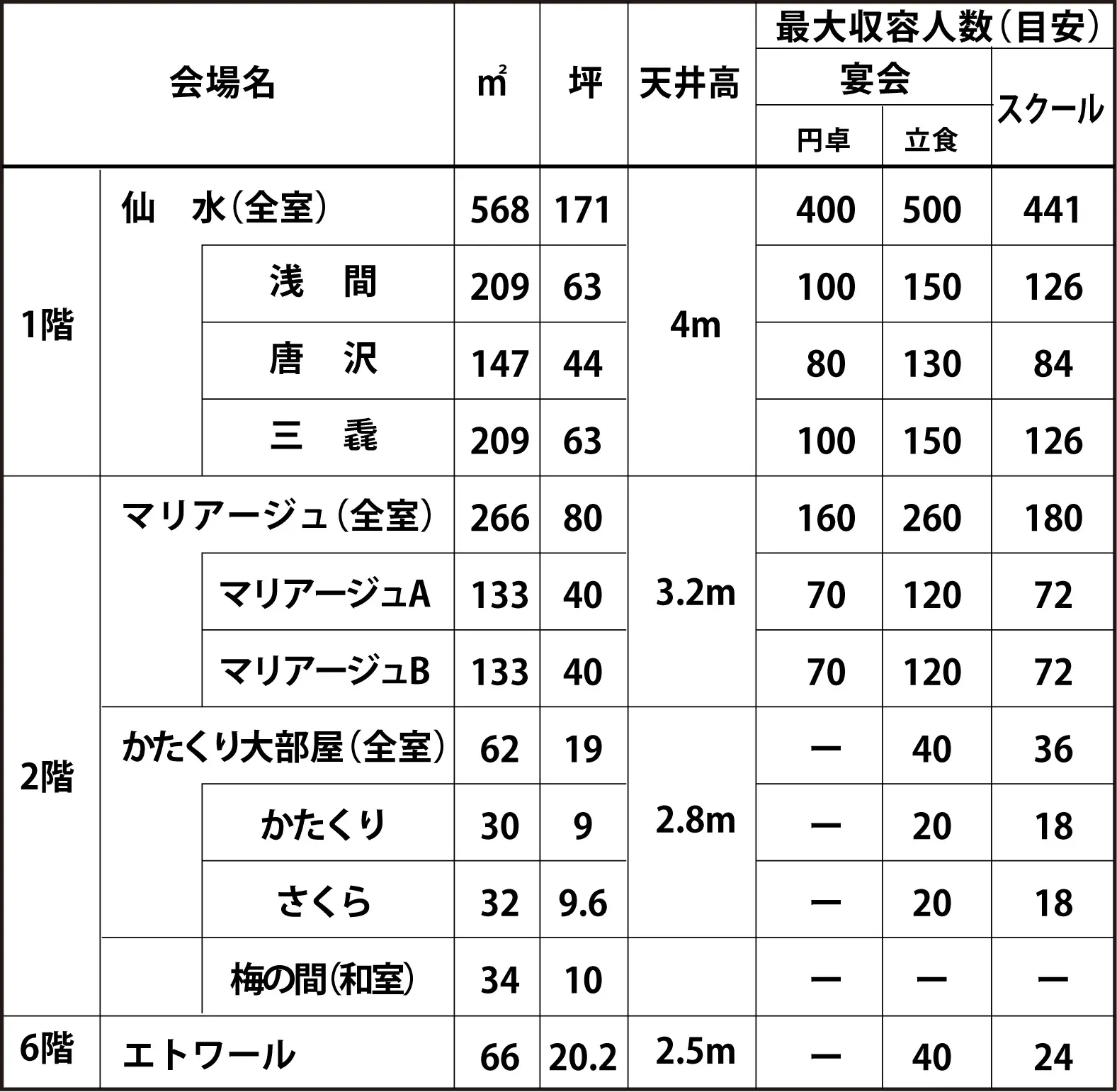 トピックス 2026.01.08 ご宴会について 企業の式典・セミナー・研修会他、忘新年会、 同窓会、イベント、法事利用のご案内 少人数様から500名様まで、ご利用に合わせた会場をご用意いたします。 記念式典、会議・研修、忘新年会、同窓会、各種イベント、音楽ライブなどにご利用ください。 広い会場、広いテーブルでゆったりとお過ごし頂けます。 〈 会場一覧 〉最大400名様まで着席可 〈 レイアウト写真一例 〉 1階仙水(全室)就活イベント等 1階仙水(全室)立食 〈 会場レイアウト例 〉 会場レイアウト案1 270名(3名掛け90台) 会場/1階「仙水」(全室) 面積/171坪(568㎡) 天井/4m 会場レイアウト案2 396名〜444名 会場/1階「仙水」 天井/4m 会場レイアウト案3 円卓360名(10名掛け36卓) 会場/1階「仙水」(浅間メイン) 天井/4m 会場レイアウト案4 円卓360名(10名掛け36卓) 会場/1階「仙水」(唐沢メイン) 天井/4m 会場レイアウト案5 96名(3名掛け32台) 会場/1階「三毳」 面積/63坪(209㎡) 天井/4m 会場レイアウト案6 円卓64名(8名掛け8卓) 会場/1階「三毳」 面積/63坪(209㎡) 天井/4m 会場レイアウト案7 円卓160名(10名掛け16卓) 会場/2階マリアージュ(全室) 天井/3.2m 会場レイアウト案8 長テーブル210名(5列) 会場/2階マリアージュ(全室) 天井/3.2m 会場レイアウト案9 円卓70名(10名掛け7卓)+円卓60名(10名掛け6卓) 会場/2階マリアージュA+マリアージュB 天井/3.2m 会場レイアウト案10 長テーブル72名(4列)+長テーブル90名(3列) 会場/2階マリアージュA+マリアージュB 天井/3.2m 会場レイアウト案11 スクール60名(3名掛け20台) 会場/2階「マリアージュA」 天井/3.2m 会場レイアウト案12 円卓70名(10名掛け7卓) 会場/2階マリアージュB 天井/3.2m 会場レイアウト案13 ロの字30名(3名掛け10台) 会場/2階「かたくり大部屋」(全室) 面積/19坪(62㎡) 天井/2.8m 会場レイアウト案14 20名(テーブル) 会場/6階エトワール 天井/2.5m 会場レイアウト案15 円卓(20卓) 会場/1階「耀」 面積/108坪(358㎡) 天井/4m お食事のご用意も承ります。 お弁当はもちろん、立食やコースもOKです!お気軽にご相談ください。 ※画像はイメージです 送迎サービスもございます。詳しくはお問い合わせください。 ご予約・お問い合わせ トピックス