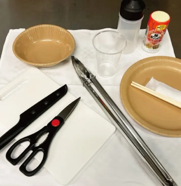 BBQでの持ってくる物削減! 【セット内容】 包丁、まな板、調理トング、網ザル、キッチンバサミ、塩胡椒、醤油、油、紙皿、紙ボウル、割箸、紙おしぼり